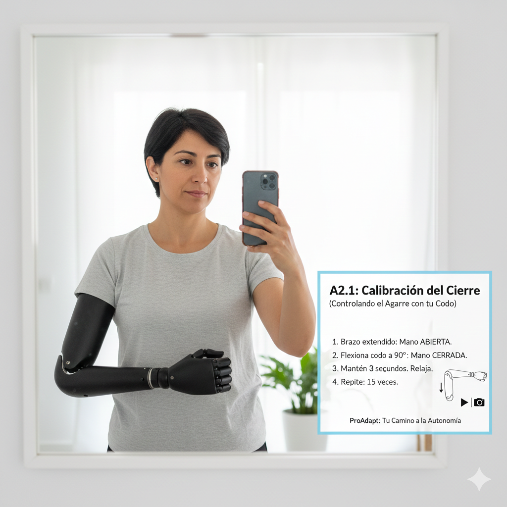 2. Comienza a doblar (flexionar) el codo lentamente hacia tu pecho. Observa cómo, a medida que el ángulo del codo se cierra, los dedos de la prótesis comienzan a cerrarse.