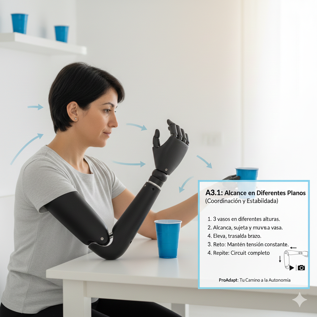 Debes alcanzar, sujetar y mover cada vaso sin que el cambio de altura haga que la mano se abra o cierre accidentalmente.